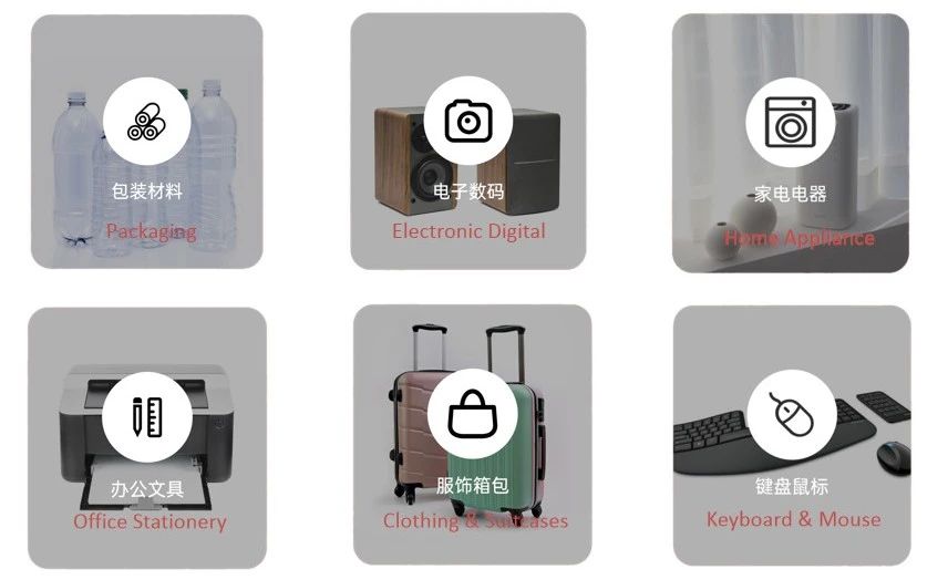 PCR材料广泛应用于消费电子及办公设备、汽车领域、包装行业及纺织行业,具体可应用于鼠标键盘、电子产品、日化包装和服饰箱包等产品,备受各大行业关注与青睐。目前,众多国际大品牌都在进行PCR材料的使用与推广。